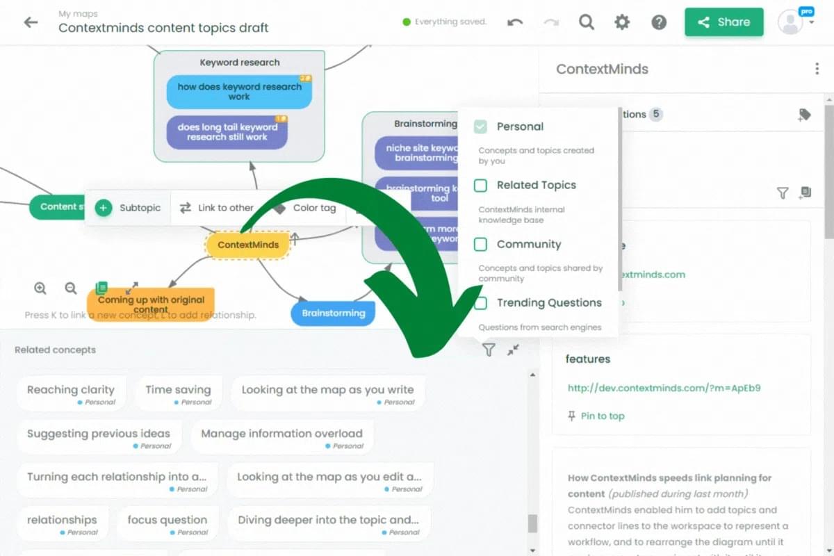 ContextMinds saves every single content idea, so you can revisit topics and keywords!
