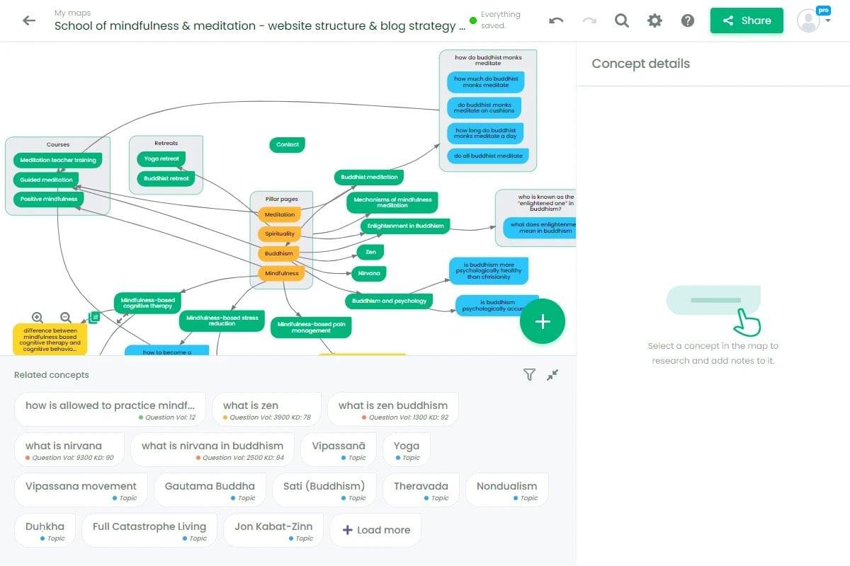 Create a visual mind map for web or blog content with AI-suggested topics and keywords.